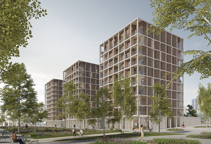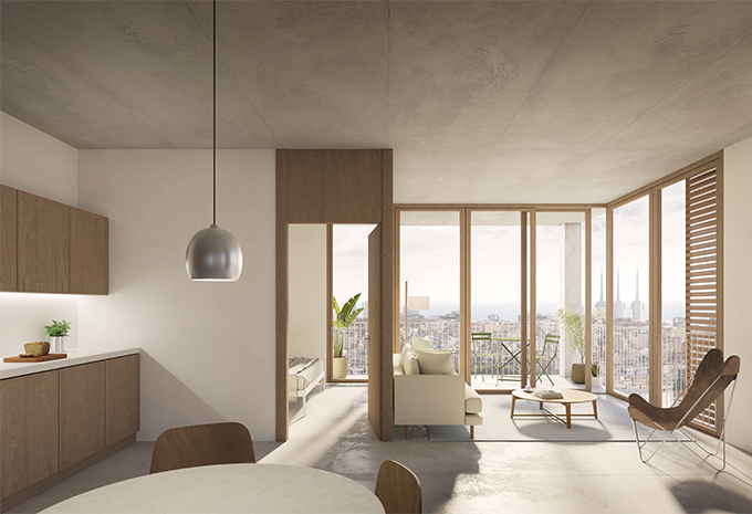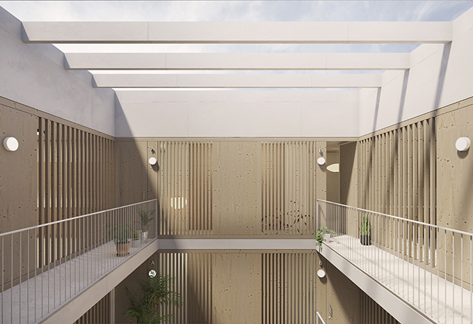 The construction system is based on a regular structural grid that enables industrialized solutions through precast concrete, CLT, or hybrid systems, optimizing time and resources. The façades, resolved with prefabricated ceramic-finished panels with a horizontal expression, reinforce the identity of the ensemble and its connection to the context, integrating passive and active sustainability strategies to reduce energy demand and environmental impact.