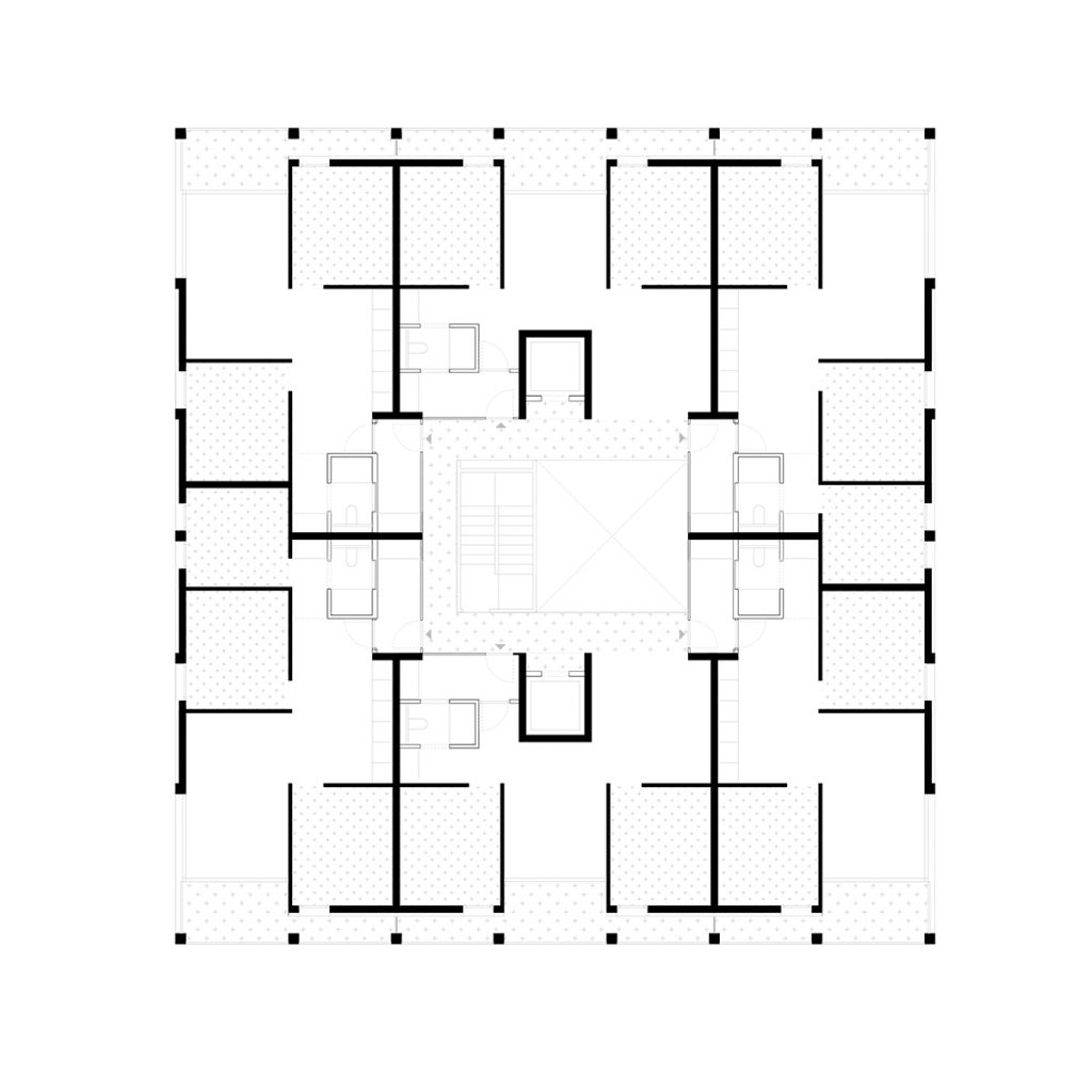 The proposal is structured around a square floor plan with a central core accommodating four dwellings per landing, ensuring efficient circulation and cross ventilation in all typologies. The project reinterprets the horizontality and domestic scale of the Casas Baratas through intermediate spaces and ground-floor passages that extend the public realm into the interior of the complex, establishing a gradual transition between private and collective domains.